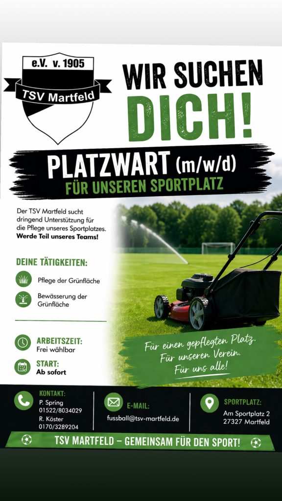 Unser Sportplatz ist das Herzstück des TSV Martfeld – hier wird trainiert, gespielt und Gemeinschaft gelebt. Damit das auch in Zukunft so bleibt, brauchen wir Verstärkung!